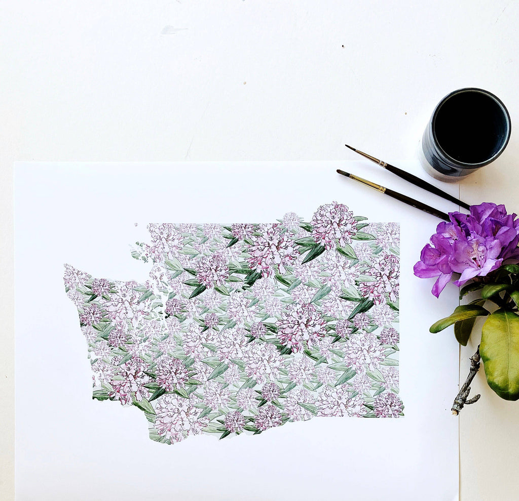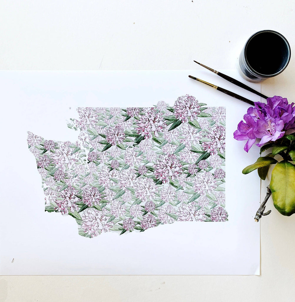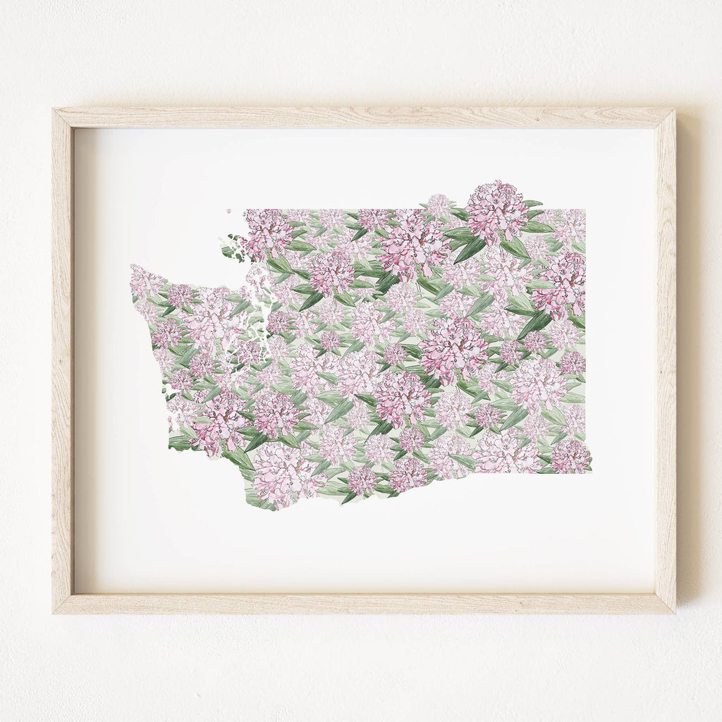 Celebrate your connection to the Evergreen State with this charming Washington State Flower Art Print. The entire state is beautifully illustrated using delicate Coast Rhododendrons—Washington's iconic state flower—creating a unique blend of geography and botanical art. Perfect for displaying alongside maps of other cherished destinations, this piece brings local pride and natural beauty to any room. Each print arrives carefully packaged in a protective cello sleeve with a sturdy white backboard, ready to frame and treasure.