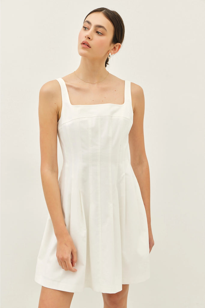 Celebrate your big moment in style with this playful mini dress designed to turn heads. The wide square neckline and sleeveless cut keep things fresh and modern, while the pleated fit-and-flare silhouette flatters every figure. Slip into comfort with a lined interior and functional pockets—because looking good shouldn't mean sacrificing practicality. The back zipper closure ensures an easy on-and-off, making this the perfect graduation day companion that's as fun as your future.