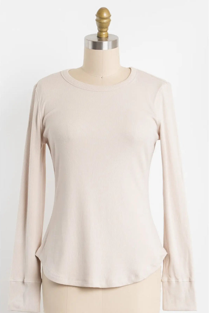 A timeless staple with a modern fit. This ribbed crew neck long sleeve is designed with a flattering fitted silhouette and a rounded hem that pairs effortlessly with your favorite denim, skirts, or layered looks. Made from a soft cotton-spandex blend, it offers breathable comfort with just the right amount of stretch to move with you. Perfect for layering or wearing on its own, this top is an essential piece for every season.